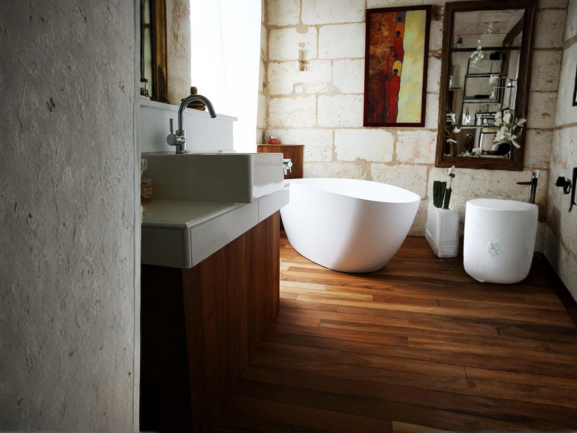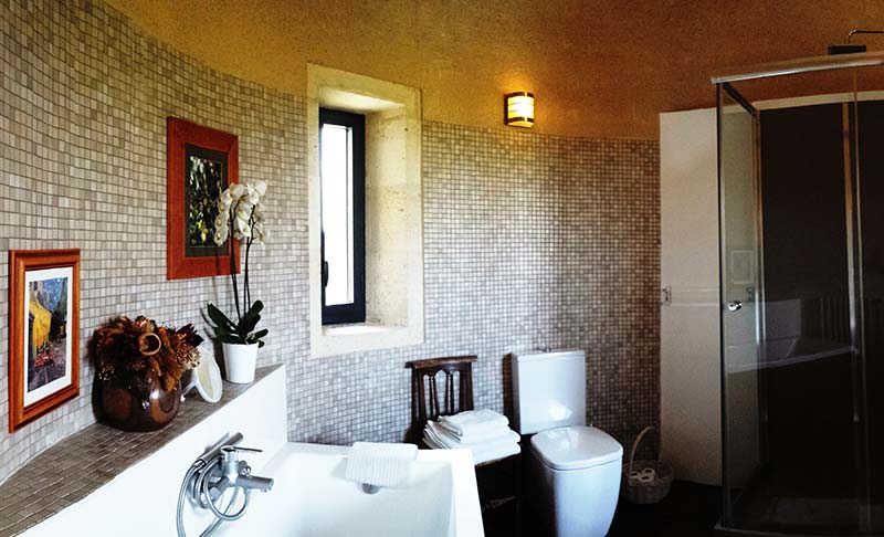 Salle de bain attenante dans la tour avec lavabo, WC, baignoire et douche.